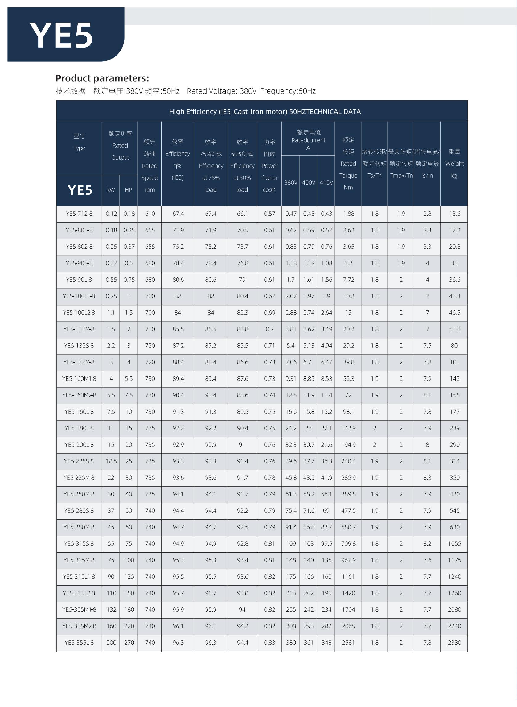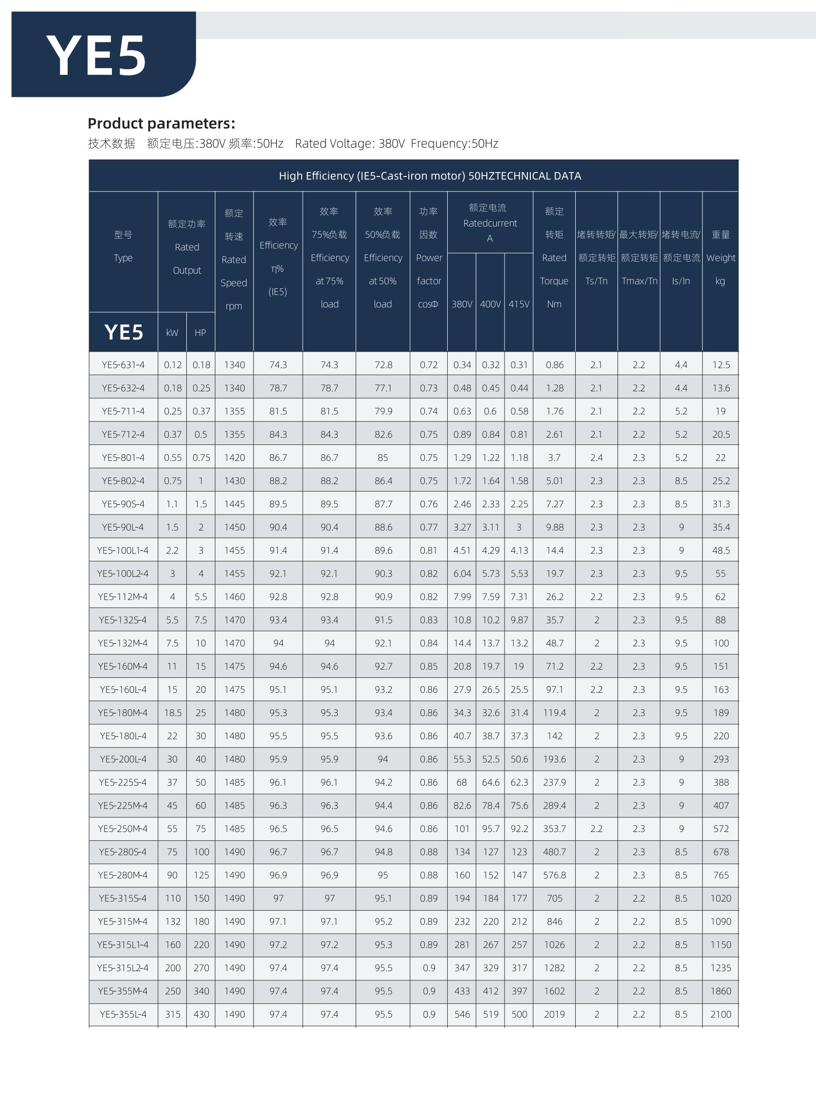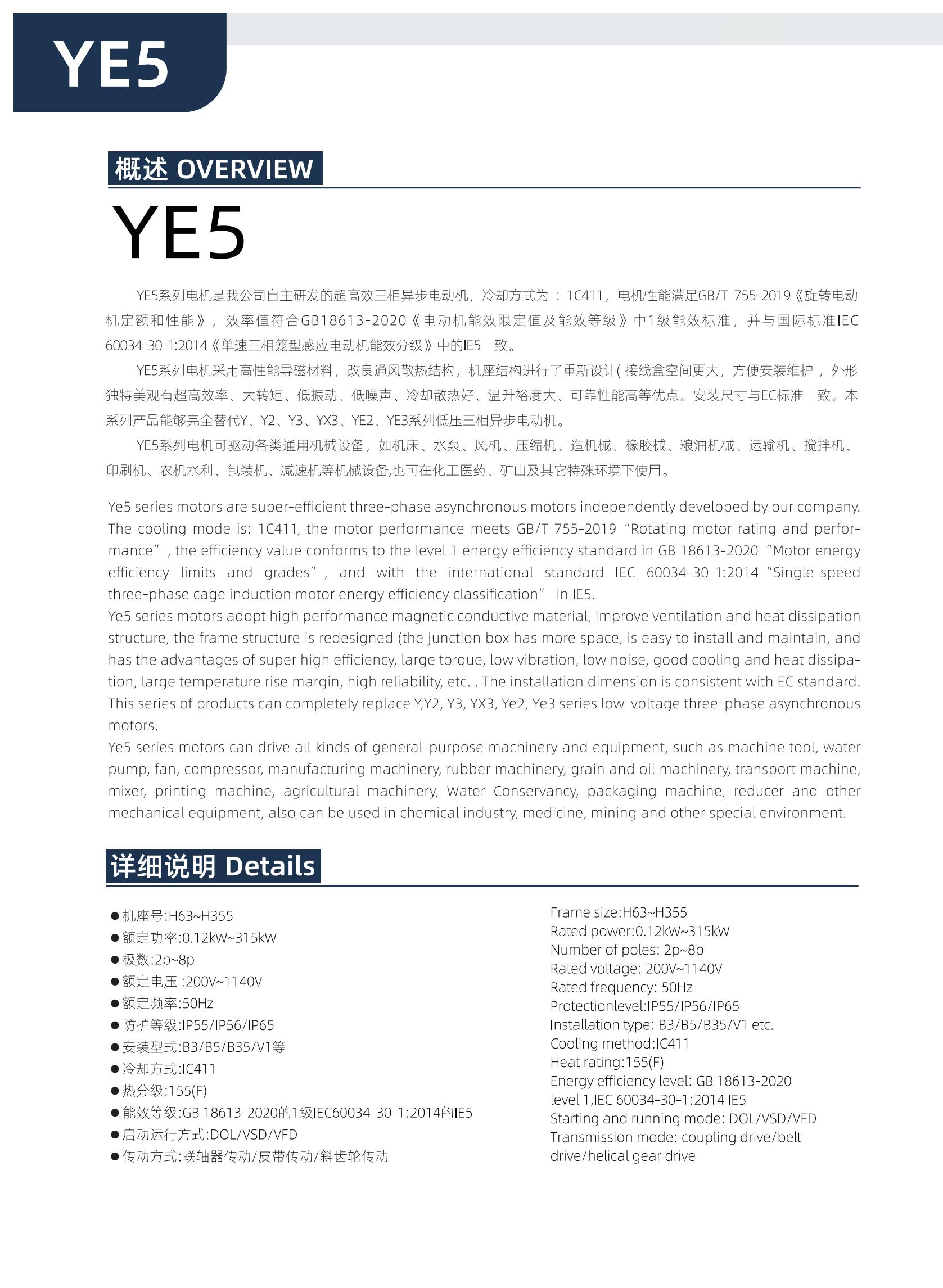 YE5系列三相異步電機的安裝尺寸符合IEC60034標準,具有結構合理,外表美觀、噪聲低、附護等級高、絕緣等級高等優點,可廣泛應用于風機、水泵、機床、壓縮機運輸機械等驅動各種通用機械設備,也可在石油、化工、鋼鐵、礦山等其它環境比較惡劣的聲所使用。